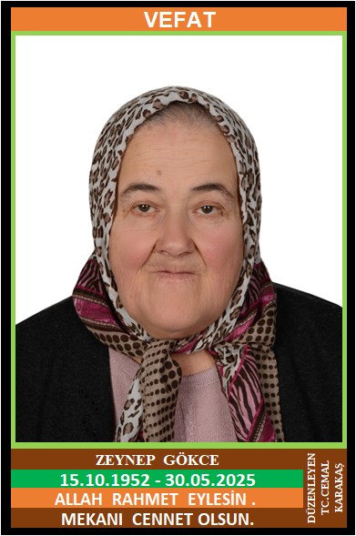 İLÇEMİZ MERKEZ MAHALLESİ NÜFUSUNA KAYITLI OLUP, MENDERES CADDESİ NO: 41/2’DE İKAMET EDEN MERHUM OSMAN ARZUM ve MERHUME FATMA ARZUM KIZI, MERHUM METİN KADİR GÖKCE EŞİ, YENİCE ŞANS OYUNLARI BAYİİ SAHİBİ ERTAN GÖKCE’NİN ANNESİ, YENİCE ESKİ ESNAFLARINDAN MERHUME NURİYE GÖKCE’NİN GELİNİ, ZEYNEP GÖKCE (15.10.1952 DOĞUMLU) HAKKIN RAHMETİNE KAVUŞMUŞTUR. CENAZESİ (30.05.2025 CUMA GÜNÜ) MERKEZ CAMİİNDE CUMA NAMAZINA MÜTEAKİP KILINACAK CENAZE NAMAZINDAN SONRA SON YOLCULUĞUNA UĞURLANACAKTIR. EŞİ MERHUM METİN KADİR GÖKCE, ERTAN GÖKCE, FUNDA ŞAHİN, GELİNİ SİBEL GÖKCE, DAMADI MERHUM MAHMUT ŞAHİN, TORUNLARI SAMET GÖKCE, ALTUG ŞAHİN, ANIL ŞAHİN, KAYINI ORHAN GÖKCE, ELTİSİ BİRSEN GÖKCE, YEĞENİ, ZAFER EMRE GÖKCE, KARDEŞLERİ HİLMİ ARZUM, HACI ARZUM, FİKRET ARZUM, NECDET ARZUM. ALLAH RAHMET EYLESİN. MEKANI CENNET OLSUN. GERİDE BIRAKTIĞI SEVENLERİNE VE AİLESİNE BAŞSAĞLIĞI VE SABIR DİLERİZ.