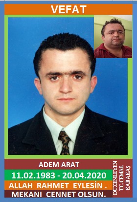 YENİCE YAZIKÖY (GÜNEY KÖYÜ) NÜFUSUNA KAYITLI OLUP, YENİCE FATİH MAHALLESİ MÜŞGEN SOKAK NO: 32/22’DE İKAMET EDEN İLÇEMİZ ŞÖFOR ESNAFLARINDAN TEVFİK ARAT’IN OĞLU, NESRİN ARAT EŞİ, ŞÖFOR ESNAFI ADEM ARAT (11.02.1983 DOĞUMLU) ELİM BİR ORMAN KAZASI SONRASI HAKKIN RAHMETİNE KAVUŞMUŞTUR. CENAZESİ (20.04.2020 PAZARTESİ GÜNÜ) YENİCE MERKEZ CAMİDE İKİNDİ NAMAZI ÖNCESİ SAAT : 15:30 DA KILINACAK CENAZE NAMAZINA MÜTEAKİP SON YOLCULUĞUNA UĞURLANACAKTIR. EŞİ NESRİN ARAT, BABASI TEVFİK ARAT, ANNESİ SULTAN ARAT. ALLAH RAHMET EYLESİN. MEKANI CENNET OLSUN. GERİDE BIRAKTIĞI SEVENLERİNE VE AİLESİNE BAŞSAĞLIĞI VE SABIR DİLERİZ.