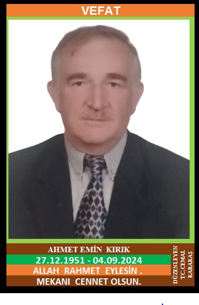 İLÇEMİZ KARAKIRIKLAR MAHALLESİ NÜFUSUNA KAYITLI OLUP, KARAKIRIKLAR MAHALLESİ KAYMAKCILAR KÜME EVLERİ NO: 13’DE İKAMET EDEN KAYMAKCI TEVFİK OLARAK BİLİNEN MERHUM TEVFİK ve MERHUME KEZBAN OĞLU, SIDIKA KIRIK EŞİ, ORÜS EMEKLİSİ AHMET EMİN KIRIK (27.12.1951 DOĞUMLU) HAKKIN RAHMETİNE KAVUŞMUŞTUR. CENAZESİ (05.09.2024 PERŞEMBE GÜNÜ) YENİCE MERKEZ CAMİİNDE ÖĞLE NAMAZINA MÜTEAKİP KILINACAK CENAZE NAMAZINDAN SONRA SON YOLCULUĞUNA UĞURLANACAKTIR. EŞİ SIDIKA KIRIK, ÇOCUKLARI MERHUM GALİP KIRIK, ŞENOL KIRIK, KALAYCILAR MAHALLESİ MEDİNE MARKET SAHİBİ MURAT KIRIK, HÜLYA KAHVECİ, DAMADI SAVAŞ KAHVECİ, KARDEŞLERİ MERHUM GALİP KIRIK, MERHUM YAŞAR KIRIK, MERHUME SAFİYE KANCA, MERHUME DURDU KARAKAYA, KEZBAN MISIRLI. ALLAH RAHMET EYLESİN. MEKANI CENNET OLSUN. GERİDE BIRAKTIĞI SEVENLERİNE VE AİLESİNE BAŞSAĞLIĞI VE SABIR DİLERİZ.
