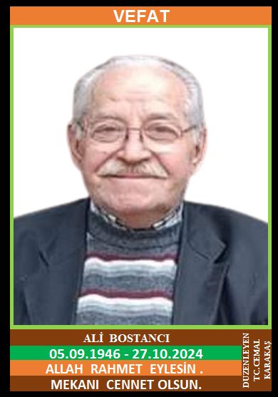 İLÇEMİZ ŞİRİNKÖY KÖYÜ NÜFUSUNA KAYITLI OLUP, ŞİRİNKÖY KÖYÜ MERKEZ KÜME EVLERİ NO:97’DE İKAMET EDEN MERHUM ALİ ve MERHUME FATİME OĞLU, HATİCE BOSTANCI EŞİ, ALMANYA EMEKLİSİ ALİ BOSTANCI (05.09.1946 DOĞUMLU) HAKKIN RAHMETİNE KAVUŞMUŞTUR. CENAZESİ (27.10.2024 PAZAR GÜNÜ) ŞİRİNKÖY MERKEZ CAMİİNDE İKİNDİ NAMAZINA MÜTEAKİP KILINACAK CENAZE NAMAZINDAN SONRA SON YOLCULUĞUNA UĞURLANACAKTIR. EŞİ HATİCE BOSTANCI, OĞLU MERHUM KAMİL BOSTANCI, TORUNLARI YASİN BOSTANCI, EMİRCAN BOSTANCI. ALLAH RAHMET EYLESİN. MEKANI CENNET OLSUN. GERİDE BIRAKTIĞI SEVENLERİNE VE AİLESİNE BAŞSAĞLIĞI VE SABIR DİLERİZ.