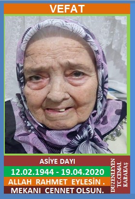 YENİCE ŞİRİNKÖY NÜFUSUNA KAYITLI OLUP, ŞİRİNKÖY ÖMERBAŞI KÜME EVLERİ NO: 81’DE İKAMET EDEN MERHUM MUHARREM ve HATİCE KIZI, ANKARALI LAKABI İLE BİLİNEN RAŞİT DAYI EŞİ, ASİYE DAYI (12.02.1944 DOĞUMLU) HAKKIN RAHMETİNE KAVUŞMUŞTUR. CENAZESİ (20.04.2020 PAZARTESİ GÜNÜ) ŞİRİNKÖY ÖMERBEŞI MAHALLESİ CAMİİNDE ÖĞLE NAMAZINDAN ÖNCE SAAT : 11:00 DA KILINACAK CENAZE NAMAZINA MÜTEAKİP SON YOLCULUĞUNA UĞURLANACAKTIR. EŞİ RAŞİT DAYI, ÇOCUKLARI AYHAN DAYI, İSA DAYI, DURDANE ÇAKIR, SANİYE DAYI, AYSEL ÇULLUK, DAMATLARI MÜNÜR ÇAKIR, MUHAMMET DAYI, ÜZEYİR ÇULLUK. ALLAH RAHMET EYLESİN. MEKANI CENNET OLSUN. GERİDE BIRAKTIĞI SEVENLERİNE VE AİLESİNE BAŞSAĞLIĞI VE SABIR DİLERİZ.
