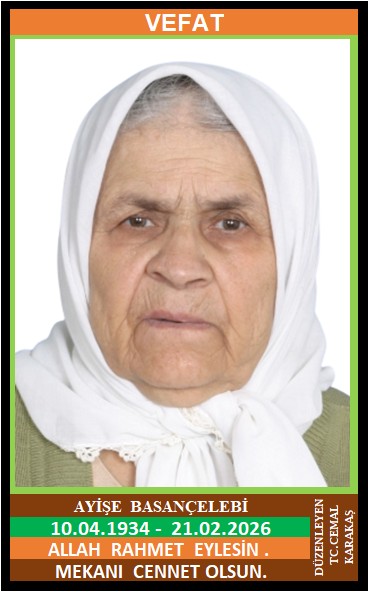 İLÇEMİZ ÇELTİK KÖYÜ SERDENGEÇLER MAHALLESİ NÜFUSUNA KAYITLI OLUP, ÖZAL MAHALLESİ ANKARA CADDESİ NO:5/6-8 ve İSMETPAŞA MAHALLESİ IŞIK SOKAK NO:39’DA İKAMET EDEN MERHUM MEHMET ve MERHUME DÖNDÜ KIZI, KORE GAZİSİ MERHUM MUSTAFA BASANÇELEBİ EŞİ, AYİŞE BASANÇELEBİ (10.04.1934 DOĞUMLU) HAKKIN RAHMETİNE KAVUŞMUŞTUR. CENAZESİ (22.02.2026 PAZAR GÜNÜ) İSMETPAŞA MAHALLESİ MERKEZ CAMİİNDE ÖĞLE NAMAZINA MÜTEAKİP KILINACAK CENAZE NAMAZINDAN SONRA SON YOLCULUĞUNA UĞURLANACAKTIR. EŞİ KORE GAZİSİ MERHUM MUSTAFA BASANÇELEBİ, ÇOCUKLARI MUSTAFA BASANÇELEBİ, HİKMET ONUR, GÜLDÜRAN TELLİ, NURTEN KOYMAT, DAMATLARI MUZAFFER ONUR, DURSUN TELLİ, ORHAN KOYMAT, KARDEŞLERİ MERHUM ALİ OSMAN ÇALIKBAŞI, ADEM ÇALIKBAŞI, RECEP ÇALIKBAŞI, SAFİYE KOYMAT, ENİŞTESİ MERHUM ORMANCI AHMET KOYMAT. ALLAH RAHMET EYLESİN. MEKANI CENNET OLSUN. GERİDE BIRAKTIĞI SEVENLERİNE VE AİLESİNE BAŞSAĞLIĞI VE SABIR DİLERİZ.