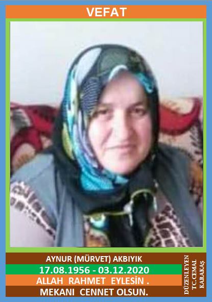 YENİCE GÜNEY KÖYÜ AKBIYIKLAR MAHALLESİ NÜFUSUNA KAYITLI OLUP, YENİCE GÜNEY KÖYÜ AKBIYIKLAR KÜME EVLERİ NO:24/B ve YİRMİBEŞLER MAHALLESİ SÜMER SOKAKDA İKAMET EDEN MERHUM MÜKERREM ve MERHUME İRFANİYE KIZI, DURSUN AKBIYIK EŞİ, AYNUR (MÜRVET) AKBIYIK (17.08.1956 DOĞUMLU) HAKKIN RAHMETİNE KAVUŞMUŞTUR. CENAZESİ (03.12.2020 PERŞEMBE GÜNÜ) YİRMİBEŞLER MAHALLESİ CAMİİNDE SAAT: 13.30’DA KILINACAK CENAZE NAMAZINDAN SONRA SON YOLCULUĞUNA UĞURLANACAKTIR. EŞİ DURSUN AKBIYIK, ÇOCUKLARI RAMAZAN AKBIYIK, FERDİ AKBIYIK, GÜLCAN AYAN, NURTEN KIRIK, DAMATLARI ADEM KIRIK, ADEM AYAN, KARDEŞLERİ ŞENOL AKBIYIK, EROL AKBIYIK. ALLAH RAHMET EYLESİN. MEKANI CENNET OLSUN. GERİDE BIRAKTIĞI SEVENLERİNE VE AİLESİNE BAŞSAĞLIĞI VE SABIR DİLERİZ.