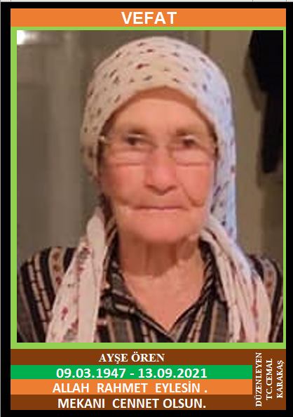 YENİCE TIR KÖYÜ RECEPBEYLER MAHALLESİ NÜFUSUNA KAYITLI OLUP, TIR KÖYÜ RECEPBEYLER KÜME EVLERİ ve FTİH MAHALLESİ SİTE SOKAK NO:6/1’DE İKAMET EDEN MERHUM DURMUŞ ve MERHUME SANİYE KIZI, İSMAİL ÖREN EŞİ, AYŞE ÖREN (09.03.1947 DOĞUMLU) HAKKIN RAHMETİNE KAVUŞMUŞTUR. CENAZESİ (14.09.2021 SALI GÜNÜ) TIR KÖYÜ RECEPBEYLER CAMİİNDE SAAT 11.00’DE ve AKABİNDE YENİCE MERKEZ CAMİİNDE ÖĞLE NAMAZINA MÜTEAKİP KILINACAK CENAZE NAMAZINDAN SONRA SON YOLCULUĞUNA UĞURLANACAKTIR. EŞİ İSMAİL ÖREN, ÇOCUKLARI ŞAMİYE ÖZGÜN, DÖNDÜ AYAN, SELMA KARAMAN, YASEMİN ÖREN, YETER ARSLAN, DERYA KANCA, DAMATLARI NİYAZİ ÖZGÜN, MERHUM HAMDİ AYAN, CAFER KARAMAN, FATİH ÖREN, KURTULUŞ ARSLAN, FATİH KANCA. ALLAH RAHMET EYLESİN. MEKANI CENNET OLSUN. GERİDE BIRAKTIĞI SEVENLERİNE VE AİLESİNE BAŞSAĞLIĞI VE SABIR DİLERİZ.