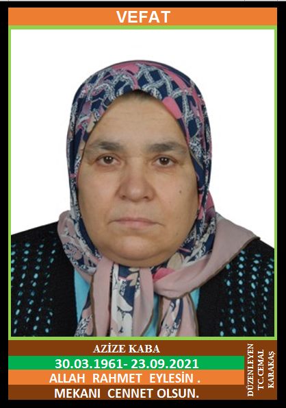 YENİCE MENDERES MAHALLESİ KABONOZLAR KÜME EVLERİ NÜFUSUNA KAYITLI OLUP, MENDERES MAHALLESİ AŞAĞIKÖY SOKAK NO:7/8’DE İKAMET EDEN MERHUM HASAN ve MERHUME SAFİYE KIZI, EMEKLİ YENİCE BELEDİYE ESKİ YAZI İŞLERİ MÜDÜRÜ MEHMET TURGUT’UN KIZ KARDEŞİ, ESKİ MENDERES MAHALLESİ MUHTARI, ESKİ ESNAF HASAN KABA EŞİ, AZİZE KABA (30.03.1961 DOĞUMLU) HAKKIN RAHMETİNE KAVUŞMUŞTUR. CENAZESİ (24.09.2021 CUMA GÜNÜ) YENİCE MERKEZ CAMİİNDE CUMA NAMAZINA MÜTEAKİP KILINACAK CENAZE NAMAZINDAN SONRA SON YOLCULUĞUNA UĞURLANACAKTIR. EŞİ HASAN KABA, ÇOCUKLARI MUHAMMET KABA, SEMRA ÇAYLI, GÜLİSTAN CİNKAVUK, DÖNDÜ BERBER, SELMA ÖZGÜ, DAMATLARI ERCAN ÇAYLI, ÜMİT BERBER, RASİM CİNKAVUK, MUSTAFA ÖZGÜ, KARDEŞLERİ MEHMET TURGUT, SABRİ TURGUT. ALLAH RAHMET EYLESİN. MEKANI CENNET OLSUN. GERİDE BIRAKTIĞI SEVENLERİNE VE AİLESİNE BAŞSAĞLIĞI VE SABIRLAR DİLERİZ.