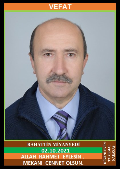 ZONGULDAK İLİ ÇAYCUMA İLÇESİ DEREKÖSELER KÖYÜ NÜFUSUNA KAYITLI OLUP, İLÇEMİZDE İLK REHABİLİTASYON MERKEZİNİ AÇAN ve YÖNETİCİLİĞİ YAPAN, DAHA SONRA DA İLÇEMİZDEN AYRILARAK ÇAYCUMA’YA YERLEŞEN EĞİTİMCİ BAHATTİN MİYANEDİ HAKKIN RAHMETİNE KAVUŞMUŞTUR. CENAZESİ (02.10.2021 CUMARTESİ GÜNÜ) ÇAYCUMA İLÇESİNDE İKİNDİ NAMAZINA MÜTEAKİP KILINACAK CENAZE NAMAZINDAN SONRA SON YOLCULUĞUNA UĞURLANACAKTIR. EŞİ FATMA MİYANYEDİ, ÇOCUĞU MERHUME ELİF MİYANYEDİ ACAR, DAMADI SİNAN ACAR. ALLAH RAHMET EYLESİN. MEKANI CENNET OLSUN. GERİDE BIRAKTIĞI SEVENLERİNE VE AİLESİNE BAŞSAĞLIĞI VE SABIR DİLERİZ.