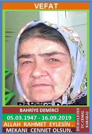 YENİCE HİSAR KÖYÜ NÜFUSUNA KAYITLI OLUP, HİSAR KÖYÜ DEMİRCİLER KÜME EVLERİ NO:26’DAE İKAMET EDEN MERHUM DURMUŞ ve DÖNDÜ KIZI, MUSTADA DEMİRCİ EŞİ BAHRİYE DEMİRCİ (05.03.1947 DOĞUMLU) HAKKIN RAHMETİNE KAVUŞMUŞTUR. CENAZESİ (17.09.2019 SALI GÜNÜ) YENİCE MERKEZ CAMİDE ÖĞLE NAMAZINA MÜTEAKİP KILINICAK CENAZE NAMAZINDAN SONRA SON YOLCULUĞUNA UĞURLANACAKTIR. EŞİ MUSTAFA DEMİRCİ, ÇOCUKLARI ŞENOL DEMİRCİ, YILMAZ DEMİRCİ, SERKAN DEMİRCİ, SERAP ODABAŞ, YELİZ KARAGÖZ, DAMATLARI EFE ODABAŞ, SERCAN KARAGÖZ. ALLAH RAHMET EYLESİN. MEKANI CENNET OLSUN. GERİDE BIRAKTIĞI SEVENLERİNE VE AİLESİNE BAŞSAĞLIĞI VE SABIR DİLERİZ.