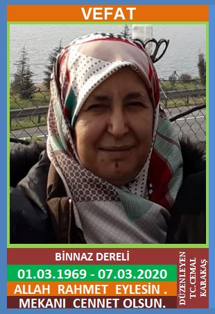 YENİCE BAĞBAŞI KÖYÜ NÜFUSUNA KAYITLI OLUP, BAĞBAŞI KÖYÜ DABAZLAR MEVKİ NO:49’DA İKAMET EDEN SATILMIŞ ve HASİME KIZI, YENİCE ESKİ ESNAFLARINDAN NAZİF DERELİ EŞİ, BİNNAZ DERELİ (01.03.1969 DOĞUMLU) HAKKIN RAHMETİNE KAVUŞMUŞTUR. CENAZESİ (07.03.2020 CUMARTESİ GÜNÜ) BAĞBAŞI KÖYÜ DABAZLAR CAMİİNDE İKİNDİ NAMAZINA MÜTEAKİP KILINACAK CENAZE NAMAZINDAN SONDA SON YOLCULUĞUNA UĞURLANACAKTIR. NAZİF DERELİ, ÇOCUKLARI AYKUT DERELİ, YUNUS EMRE DERELİ, BURAK DERELİ, OĞUZ DERELİ. ALLAH RAHMET EYLESİN. MEKANI CENNET OLSUN. GERİDE BIRAKTIĞI SEVENLERİNE VE AİLESİNE BAŞSAĞLIĞI VE SABIR DİLERİZ.