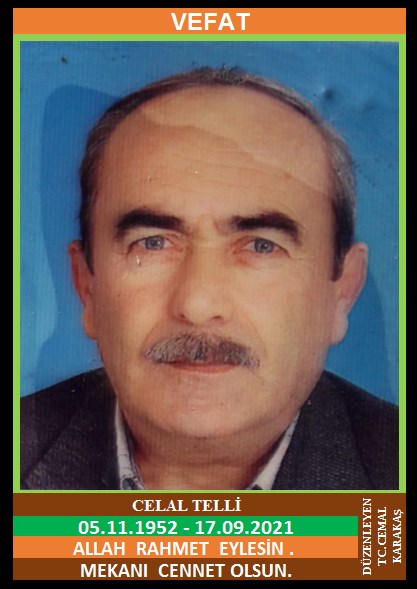 YENİCE İSMETPAŞA MAHALLESİ NÜFUSUNA KAYITLI OLUP, KARABÜK İLİ SOĞUKSU MAHALLESİ MELİSE CADDESİ TOKİ K1 7 SİTESİ NO:42A/18’DE İKAMET EDEN MERHUM CEMAL ve MERHUME AYŞE OĞLU, MERYEM TELLİ EŞİ, KARABÜK BELEDİYESİ EMEKLİSİ CELAL TELLİ (05.11.1952 DOĞUMLU) HAKKIN RAHMETİNE KAVUŞMUŞTUR. CENAZESİ (18.09.2021 CUMARTESİ GÜNÜ) İSMETPAŞA MAHALLESİ MERKEZ CAMİİNDE ÖĞLE NAMAZINA MÜTEAKİP KILINACAK CENAZE NAMAZINDAN SONRA SON YOLCULUĞUNA UĞURLANACAKTIR. EŞİ MERYEM TELLİ, ÇOCUKLARI HAYRETTİN TELLİ, NERİMAN MUŞ, DAMADI HAKAN MUŞ, KARDEŞLERİ MERHUM AHMET İNAM, SIDIKA İNAM, MÜRVET KARAMAN, BİLAL TELLİ, KEZBAN İNAM, MEHMET TELLİ, BAHTİYAR DEMİRKIRAN. ALLAH RAHMET EYLESİN. MEKANI CENNET OLSUN. GERİDE BIRAKTIĞI SEVENLERİNE VE AİLESİNE BAŞSAĞLIĞI VE SABIR DİLERİZ.
