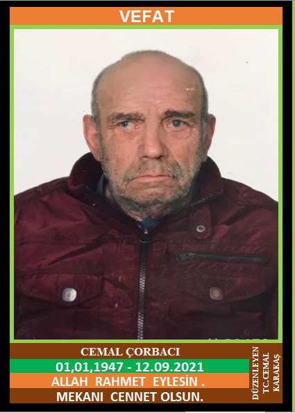 YENİCE YENİKÖY HACIBEYLER MAHALLESİ NÜFUSUNA KAYITLI OLUP, KARABÜK İLİ SOĞUKSU MAHALLESİ’NDE İKAMET EDEN MERHUM İSMAİL ve MERHUME SATI OĞLU, EMİNE ÇORBACI EŞİ, CEMAL ÇORBACI (01.01.1947 DOĞUMLU) HAKKIN RAHMETİNE KAVUŞMUŞTUR. CENAZESİ (12.09.2021 PAZAR GÜNÜ) YENİKÖY MERKEZ CAMİİNDE ÖĞLE NAMAZINA MÜTEAKİP KILINACAK CENAZE NAMAZINDAN SONRA SON YOLCULUĞUNA UĞURLANACAKTIR. EŞİ EMİNE ÇORBACI, ÇOCUKLARI MURAT ÇORBACI, YUNUS ÇORBACI, MUSTAFA ÇORBACI. ALLAH RAHMET EYLESİN. MEKANI CENNET OLSUN. GERİDE BIRAKTIĞI SEVENLERİNE VE AİLESİNE BAŞSAĞLIĞI VE SABIR DİLERİZ.