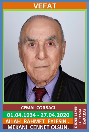 YENİCE IBIRCAK KÖYÜ NÜFUSUNA KAYITLI OLUP, ALMANYA BOTTROP ŞEHRİNDE İKAMET EDEN MERHUM DURMUŞ ve ZEYNEP OĞLU, MERHUM NACİYE ÇORBACI EŞİ, CEMAL ÇORBACI (01.04.1934 DOĞUMLU) HAKKIN RAHMETİNE KAVUŞMUŞTUR. ALMANYA’DAN GETİRİLEN CENAZE 30 NİSAN 2020 PERŞEMBE GÜNÜ IBRICAK KÖYÜNDE KILINAN CENAZE NAMAZINDAN SONRA AİLE MEZARLIĞINA DEFNEDİLMİŞTİR. EŞİ MERHUM NACİYE ÇORBACI, ÇOCUKLARI ZEYNEP ÇORBACI, NECLA ÇORBACI, NERMİN ÇORBACI, YASEMİN ÇORBACI, KARDEŞLERİ MERHUM İSMAİL ÇORBACI, MERHUM HAKKI ÇORBACI, MERHUM RIFAT ÇORBACI, NACİYE KAZAN, YEĞENİ CHP İLÇE YÖNETİM KURULU ÜYESİ HİKMET ÇORBACI. ALLAH RAHMET EYLESİN. MEKANI CENNET OLSUN. GERİDE BIRAKTIĞI SEVENLERİNE VE AİLESİNE BAŞSAĞLIĞI VE SABIR DİLERİZ.