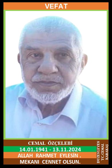 İLÇEMİZ AKMANLAR KÖYÜ SOĞUKSU MAHALLESİ NÜFUSUNA KAYITLI OLUP, İSTANBUL’DA İKAMET EDEN MERHUM SÜLEYMAN ve MERHUME AYİŞE OĞLU, MERHUM SAFİYE ÖZÇELEBİ VE TONYALI FATMA ÖZÇELEBİ EŞİ, CEMAL ÖZÇELEBİ (14.01.1941 DOĞUMLU) HAKKIN RAHMETİNE KAVUŞMUŞTUR. CENAZESİ (14.11.2024 PERŞEMBE GÜNÜ) AKMANLAR KÖYÜ SOĞUKSU MAHALLESİ CAMİİNDE ÖĞLE NAMAZINA MÜTEAKİP KILINACAK CENAZE NAMAZINDAN SONRA SON YOLCULUĞUNA UĞURLANACAKTIR. EŞİ MERHUM SAFİYE ÖZÇELEBİ VE TONYALI FATMA ÖZÇELEBİ, ÇOCUKLARI MEHMET ÖZÇELEBİ, CELAL ÖZÇELEBİ, SÜLEYMAN ÖZÇELEBİ, OSMAN ÖZÇELEBİ, İHSAN ÖZÇELEBİ, HANİFE KARAKURLUK, AYŞE ERDEM, GÜLER ÖZÇELEBİ, ASİYE ÖZÇELEBİ, GÜLŞEN KILIÇ, DAMATLARI CEMAL KARAKURLUK, YAVER ERDEM, MESUT KILIÇ. ALLAH RAHMET EYLESİN. MEKANI CENNET OLSUN. GERİDE BIRAKTIĞI SEVENLERİNE VE AİLESİNE BAŞSAĞLIĞI VE SABIR DİLERİZ.