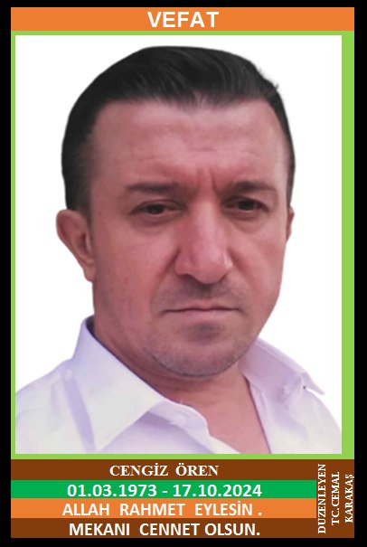 İLÇEMİZ TIR KÖYÜ RECEPBEYLER MAHALLESİ NÜFUSUNA KAYITLI OLUP, ZONGULDAK İLİ KOZLU İLÇESİNDE İKAMET EDEN MERHUM MUHARREM ve MERHUME HANİFE OĞLU, MELEK ÖREN EŞİ, KOZLU ESNAFLARINDAN CENGİZ ÖREN (01.03.1973 DOĞUMLU) HAKKIN RAHMETİNE KAVUŞMUŞTUR.CENAZESİ (18.0410.2024 CUMA GÜNÜ) ZONGULDAK İLİ KOZLU İLÇESİ 19 MAYIS CAMİİNDE İKİNDİ NAMAZINA MÜTEAKİP KILINACAK CENAZE NAMAZINDAN SONRA SON YOLCULUĞUNA UĞURLANACAKTIR. EŞİ MELEK ÖREN, ÇOCUKLARI YAREN ÖREN, SEVDE ÖREN, ELİSA ÖREN, MEHMET ÖREN, KARDEŞLERİ NURETTİN ÖREN, GÜLİSTAN ÖRENLİ, MERHUME HATİCE ÖRENLİ, NEZAHAT ARDIŞ, NAİLE KABAK, ENİŞTELERİ İSA ÖRENLİ, YENİCE DDY. İSTASYON ŞEFİ VAHİT ÖRENLİ, COŞKUN KABAK, HASAN ARDIŞ. ALLAH RAHMET EYLESİN. MEKANI CENNET OLSUN. GERİDE BIRAKTIĞI SEVENLERİNE VE AİLESİNE BAŞSAĞLIĞI VE SABIR DİLERİZ.