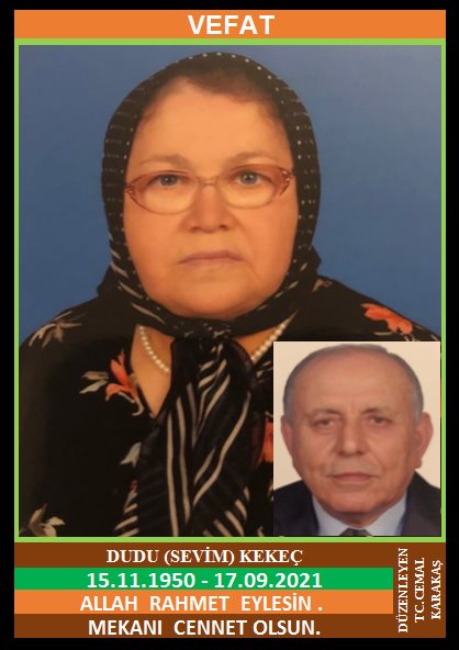 YENİCE KALAYCILAR MAHALLESİ NÜFUSUNA KAYITLI OLUP, ALMANYA’DA ve KALAYCILAR MAHALLESİ’NDE İKAMET EDEN MERHUM AKTÖR LAKABI İLE BİLİNEN HALİL İBRAHİM ÇENGELCİK ve MERHUME FATİME ÇENGELCİK KIZI, ALMANYA EMEKLİSİ MUSTAFA KEKEÇ EŞİ, DUDU (SEVİM) KEKEÇ (15.11.1950 DOĞUMLU) HAKKIN RAHMETİNE KAVUŞMUŞTUR. CENAZESİ (18.09.2021 CUMARTESİ GÜNÜ) YENİCE KALAYCILAR MAHALLESİ UZUMKUM İSTASYON CAMİİNDE ÖĞLE NAMAZINA MÜTEAKİP KILINACAK CENAZE NAMAZINDAN SONRA SON YOLCULUĞUNA UĞURLANACAKTIR. EŞİ ALMAYA EMEKLİSİ MUSTAFA KEKEÇ, ÇOCUKLARI KERİM KEKEÇ, MURAT KEKEÇ, ZAFER KEKEÇ, KARDEŞLERİ MEHMET ALİ ÇENGELCİK, NAZMİYE BELEN, MÜŞERREF KEKEÇ, MÜRVET TAŞÇI. ALLAH RAHMET EYLESİN. MEKANI CENNET OLSUN. GERİDE BIRAKTIĞI SEVENLERİNE VE AİLESİNE BAŞSAĞLIĞI VE SABIR DİLERİZ.