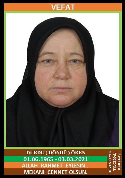 YENİCE ÖRENKÖY NÜFUSUNA KAYITLI OLUP, YENİCE FATİH MAHALLESİ SİTE SOKAK NO:20/8’DE İKAMET EDEN HASAN ERİŞOĞLU ve  MERHUME ARİFE ERİŞOĞLU KIZI, MADEN EMEKLİSİ SEBAHATTİN ÖREN EŞİ, YENİCE BİRLİK OTOBÜS SAHİBİ ALPER ERİŞOĞLU’NUN ABLASI, DURDU (DÖNDÜ) ÖREN (01.06.1965 DOĞUMLU) HAKKIN RAHMETİNE KAVUŞMUŞTUR. CENAZESİ  (03.03.2021 ÇARŞAMBA GÜNÜ) YENİCE FATİH MAHALLESİ SİTE SOKAKDAKİ EVİN ÖNÜNDE SAAT: 14.00’DA HELALLEŞME VE ÖRENKÖY MERKEZ CAMİİNDE SAAT: 16.30’DA KILINACAK CENAZE NAMAZINA MÜTEAKİP AİLE MEZARLIĞINA DEFNEDİLEREK SON YOLCULUĞUNA UĞURLANACAKTIR. BABASI HASAN ERİŞOĞLU, EŞİ MADEN EMEKLİSİ SEBAHATTİN ÖREN, ÇOCUKLARI ÜMİT ÖREN, DERYA DEDEOĞLU, GELİNİ İREM ÖREN, DAMADI SEÇKİN DEDEOĞLU, KARDEŞİ ALPER ERİŞOĞLU. ALLAH RAHMET EYLESİN. MEKANI CENNET OLSUN. GERİDE BIRAKTIĞI SEVENLERİNE VE AİLESİNE BAŞSAĞLIĞI VE SABIR DİLERİZ.