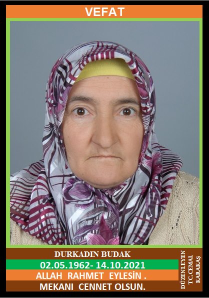 YENİCE DEREBAŞI KÖYÜ SEPETÇİLER MAHALLE NÜFUSUNA KAYITLI OLUP, YENİCE KALAYCILAR MAHALLESİ OSMANLI SOKAK NO:6/1’DE İKAMET EDEN MERHUM HÜSNÜ ve MERHUME HATİCE KIZI, MERHUM ŞABAN BUDAK EŞİ, DURKADIN BUDAK (02.05.1962 DOĞUMLU) HAKKIN RAHMETİNE KAVUŞMUŞTUR. CENAZESİ (15.10.2021 CUMA GÜNÜ) YENİCE ATATÜRK MAHALLESİ MERKEZ CAMİİNDE CUMA NAMAZINA MÜTEAKİP KILINACAK CENAZE NAMAZINDAN SONRA SON YOLCULUĞUNA UĞURLANACAKTIR. EŞİ MERHUM ŞABAN BUDAK, ÇOCUKLARI MUSA BUDAK, AYŞE BUDAK, KARDEŞLERİ SATILMIŞ BUDAK, DURSUN BUDAK, MEHMET BUDAK. ALLAH RAHMET EYLESİN. MEKANI CENNET OLSUN. GERİDE BIRAKTIĞI SEVENLERİNE VE AİLESİNE BAŞSAĞLIĞI VE SABIR DİLERİZ.