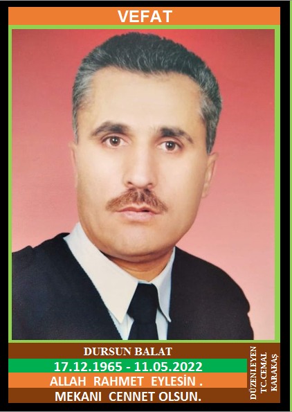 YENİCE ATATÜRK MAHALLESİ NÜFUSUNA KAYITLI OLUP, ZONGULDAK’TA İKAMET EDEN MERHUM İNŞAAT USTASI İSMAİL BALAT ve HANİFE BALAT OĞLU, VELİME BALAT EŞİ, T.C.D.D. YOLLARI GAR MÜDÜRÜ EMEKLİSİ DURSUN BALAT (17.12.1965 DOĞUMLU) HAKKIN RAHMETİNE KAVUŞMUŞTUR. CENAZESİ (12.05.2022 PERŞEMBE GÜNÜ) ATATÜRK MAHALLESİ MERKEZ CAMİİNDE İKİNDİ NAMAZINA MÜTEAKİP KILINACAK CENAZE NAMAZINDAN SONRA SON YOLCULUĞUNA UĞURLANACAKTIR. ANNESİ HANİFE BALAT, EŞİ VELİME BALAT, ÇOCUKLARI SAMET BALAT, OKTAY BALAT, KARDEŞLERİ NEDİM BALAT, AKİF BALAT, ADEM BALAT, GÜLFİDAN BALAT, NURGÜL ESMER. ALLAH RAHMET EYLESİN. MEKANI CENNET OLSUN. GERİDE BIRAKTIĞI SEVENLERİNE VE AİLESİNE BAŞSAĞLIĞI VE SABIR DİLERİZ.