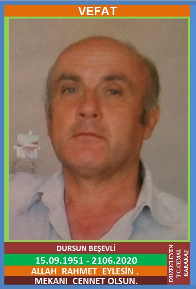 YENİCE ATATÜRK MAHALLESİ NÜFUSUNA KAYITLI OLUP, KARABÜK İLİ BEŞBİNEVLER MAHALLESİ 75.YILDA İKAMET EDEN MERHUM HALİL İBRAHİM ve BAHRİYE OĞLU, NEZAKET BEŞEVLİ EŞİ, KARABÜK DEMİRÇELİK EMEKLİSİ, DURSUN BEŞEVLİ (15.09.1951 DOĞUMLU) HAKKIN RAHMETİNE KAVUŞMUŞTUR. CENAZESİ (22.06.2020 PAZARTESİ GÜNÜ) KARABÜK BEŞBİNEVLER MAHALLESİ 75. YIL FATİH CAMİİNDE SAAT 12.00’DA ve AKABİNDE YENİCE ATATÜRK MAHALLESİ MERKEZ CAMİİNDE ÖĞLE NAMAZINDAN SONRA SAAT : 14:00’DA KILINACAK CENAZE NAMAZINA MÜTEAKİP SON YOLCULUĞUNA UĞURLANACAKTIR. EŞİ NEZAKET BEŞEVLİ, ÇOCUKLARI EMRAH BEŞEVLİ, EBRU ÖZCAN, DAMADI MURAT ÖZCAN, BACANAKLARI EMRULLAH DURAK, ŞABAN BEŞEVLİ. ALLAH RAHMET EYLESİN. MEKANI CENNET OLSUN. GERİDE BIRAKTIĞI SEVENLERİNE VE AİLESİNE BAŞSAĞLIĞI VE SABIR DİLERİZ.