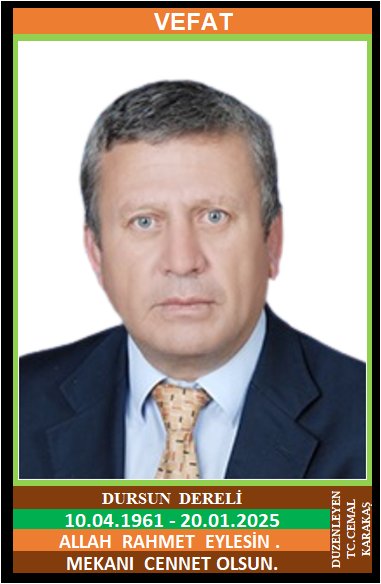 İLÇEMİZ BAĞBAŞI KÖYÜ DABAZLAR MAHALLESİ NÜFUSUNA KAYITLI OLUP, BAĞBAŞI KÖYÜ DABAZLAR KÜME EVLERİ NO: 17 ve İSMETPAŞA MAHALLESİ DORUK SOKAK NO:3B/2’DE İKAMET EDEN MERHUM HÜSEYİN ve HANİFE OĞLU, KEZBAN DERELİ EŞİ, EMEKLİ ORMAN MUHAFAZA MEMURU DURSUN DERELİ (10.04.1961 DOĞUMLU) HAKKIN RAHMETİNE KAVUŞMUŞTUR. CENAZESİ (21.01.2025 SALI GÜNÜ) BAĞBAŞI KÖYÜ DABAZLAR MAHALLESİ CAMİİNDE İKİNDİ NAMAZINA MÜTEAKİP KILINACAK CENAZE NAMAZINDAN SONRA SON YOLCULUĞUNA UĞURLANACAKTIR. EŞİ KEZBAN DERELİ, ÇOCUKLARI NEŞE ŞANLIER, ŞİRİN KOCA, GÜLAY YİRMİBEŞ, DAMATLARI MUSTAFA ŞANLIER, HAKAN KOCA, NİHAT YİRMİBEŞ, KARDEŞLERİ NEZAKET KOCA, FATMA KOCA, SATI DERELİ, MERHUME AYŞE KOYMATOĞLU, ŞAHİZER ARAT, ENİŞTELERİ SEFA KOCA, MERHUM KEMAL KOCA, KENAN DERELİ, HÜSEYİN ARAT. ALLAH RAHMET EYLESİN. MEKANI CENNET OLSUN. GERİDE BIRAKTIĞI SEVENLERİNE VE AİLESİNE BAŞSAĞLIĞI VE SABIR DİLERİZ.