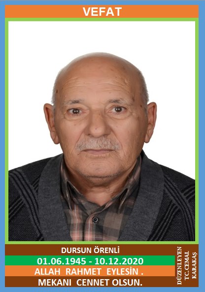 YENİCE TIR KÖYÜ NÜFUSUNA KAYITLI OLUP, TİR KÖYÜ YENİ KÜME EVLERİ NO: 87A/2’DE İKAMET EDEN MERHUM ABDULLAH ve MERHUME ZELİHA OĞLU, SAADET ÖRENLİ EŞİ, ALMANYA EMEKLİSİ DURSUN ÖRENLİ (01.06.1945 DOĞUMLU) HAKKIN RAHMETİNE KAVUŞMUŞTUR. CENAZESİ (11.12.2020 CUMA GÜNÜ) TİR KÖYÜ GÜNEY İLKÖĞRETİM OKULU ÖNÜNDE SAAT: 13.30’DA KILINACAK CENAZE NAMAZINDAN SONRA SON YOLCULUĞUNA UĞURLANACAKTIR. EŞİ SAADET ÖRENLİ, ÇOCUKLARI MURAT ÖRENLİ, FEDİME KAHVECİ, GÜLSÜN KARABASAN, TÜRKAN USLUBAŞ, DAMATLARI İSMAİL KAHVECİ, MUSTAFA KAHVECİ, ŞADAN USLUBAŞ. ALLAH RAHMET EYLESİN. MEKANI CENNET OLSUN. GERİDE BIRAKTIĞI SEVENLERİNE VE AİLESİNE BAŞSAĞLIĞI VE SABIR DİLERİZ.
