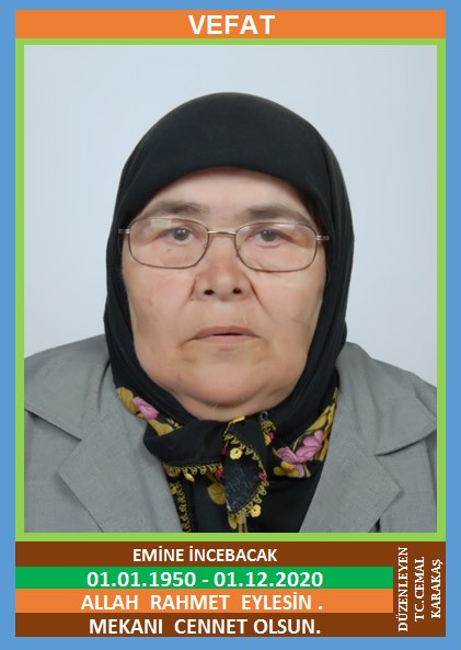 YENİCE YAZIKÖY NÜFUSUNA KAYITLI OLUP, YENİCE MERKEZ MAHALLESİ HANYANI CADDESİ NO:8/8’DE İKAMET EDEN MERHUM OSMAN ve MERHUME HANİFE KIZI, ALMANYA EMEKLİSİ RECEP İNCEBACAK EŞİ, EMİNE İNCEBACAK (01.01.1950 DOĞUMLU) HAKKIN RAHMETİNE KAVUŞMUŞTUR. CENAZESİ (02.12.2020 ÇARŞAMBA GÜNÜ) YENİCE MERKEZ CAMİİNDE SAAT: 14.00’DA KILINACAK CENAZE NAMAZINDAN SONRA SON YOLCULUĞUNA UĞURLANACAKTIR. ÇOCUKLARI CENGİZ İNCEBACAK, YILMAZ İNCEBACAK, FATMA BEYTEKİN, ZEKİYE KOYMALI, DAMATLARI BÜLENT BEYTEKİN, HÜSNÜ KOYMALI. ALLAH RAHMET EYLESİN. MEKANI CENNET OLSUN. GERİDE BIRAKTIĞI SEVENLERİNE VE AİLESİNE BAŞSAĞLIĞI VE SABIR DİLERİZ.