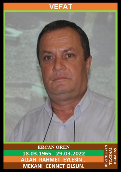 YENİCE TIR KÖYÜ RECEPBEYLER MAHALLESİ NÜFUSUNA KAYITLI OLUP, KARABÜK’TE İKAMET EDEN MERHUM HASAN ve HAYRİYE OĞLU, İLKAY ÖREN EŞİ, KARABÜK ORMAN İŞLETME MÜDÜRLÜĞÜNDE ORMAN MUHAFAZA MEMURU OLARAK GÖREV YAPAN, ERCAN ÖREN (18.03.1965 DOĞUMLU) HAKKIN RAHMETİNE KAVUŞMUŞTUR. CENAZESİ (28.03.2022 SALI GÜNÜ) YENİCE MERKEZ CAMİİNDE İKİNDİ NAMAZINA MÜTEAKİP KILINACAK CENAZE NAMAZINDAN SONRA SON YOLCULUĞUNA UĞURLANACAKTIR. EŞİ İLKAY ÖREN, ÇOCUKLARI SİNAN ÖREN, SERKAN ÖREN, KÜBRA ÖREN, GELİNLERİ ELİF ÖREN, BÜŞRA ÖREN, KARDEŞLERİ FİKRİ ÖEN, HİSAR KÖYÜ CAMİ İMAMI ERTAN ÖREN, HATİCE YILMAZ, NEZAKET ÖREN, NAFİYE TEMAM, ENİŞTELERİ NECATİ YILMAZ, FAHRİ ÖREN, YAŞAR TEMAM. ALLAH RAHMET EYLESİN. MEKANI CENNET OLSUN. GERİDE BIRAKTIĞI SEVENLERİNE VE AİLESİNE BAŞSAĞLIĞI VE SABIR DİLERİZ.
