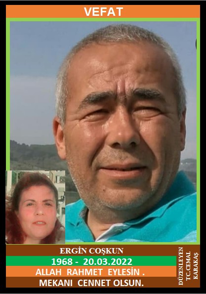 YENİCE ZİRAAT ODASI BAŞKANI CEMAL KARAKAŞ’IN AMCASI TAHİR KARAKAŞ ve ŞAHİZE KARAKAŞ’IN DAMADI, ERKAN KARAKAŞ’IN ENİŞTESİ, İREM ÇOŞKUN’UN BABASI GÖNÜL COŞKUN’UN EŞİ HAKKIN RAHMETİNE KAVUŞMUŞTUR. CENAZESİ (21.03.2022 PAZARTESİ GÜNÜ) BURSA İLİ NİLÜFER İLÇESİ HAFIZ TAYYAR ARSEVEN CAMİİNDE ( YÜZÜNCÜYIL METRO İSTASYONU YANI) ÖĞLE NAMAZINA MÜTEAKİP KILINACAK CENAZE NAMAZINDAN SONRA SON YOLCULUĞUNA UĞURLANACAKTIR. EŞİ GÖNÜL COŞKUN, KIZI İREM COŞKUN, KAYINVALİESİ ŞAZİYE KARAKAŞ, KAYINBİLADERİ ERKAN KARAKAŞ. ALLAH RAHMET EYLESİN. MEKANI CENNET OLSUN. GERİDE BIRAKTIĞI SEVENLERİNE VE AİLESİNE BAŞSAĞLIĞI VE SABIR DİLERİZ.