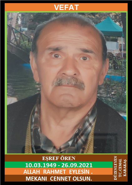 YENİCE TIR KÖYÜ RECEPBEYLER MAHALLESİ NÜFUSUNA KAYITLI OLUP, YENİCE MERKEZ MAHALLE ESKİ SANAYİ CADDESİ NO: 15/11’DE İKAMET EDEN MERHUM DURMUŞ ve MERHUME DÖNDÜ OĞLU, DÖNDÜ ÖREN EŞİ, ORMAN İSLETMESİ EMEKLİSİ EŞREF ÖREN (10.03.1949 DOĞUMLU) HAKKIN RAHMETİNE KAVUŞMUŞTUR.CENAZESİ BUGÜN (26.09.2021 PAZAR GÜNÜ) YENİCE MERKEZ CAMİİNDE İKİNDİ NAMAZINA MÜTEAKİP KILINACAK CENAZE NAMAZINDAN SONRA SON YOLCULUĞUNA UĞURLANACAKTIR. EŞİ DÖNDÜ ÖREN, ÇOCUKLARI ŞAHİN ÖREN, MERHUM ŞADİ ÖREN, FİLİZ KİRENLİ, AYLA ÖZGÜN, SELMA YILMAZ, DAMATLARI BERBER SELAHTTİN KİRENLİ, ÖZKAN ÖZGÜN, FERDİ YILMAZ, KARDEŞLERİ HAKKI ÖREN, İSLAM ÖREN, ADNAN ÖREN. ALLAH RAHMET EYLESİN. MEKANI CENNET OLSUN. GERİDE BIRAKTIĞI SEVENLERİNE VE AİLESİNE BAŞSAĞLIĞI VE SABIR DİLERİZ.