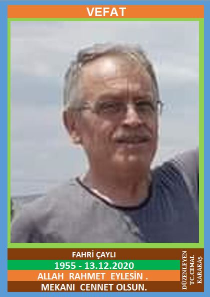 SİNOP’UN AYANCIK İLÇESİ NÜFUSUNA KAYITLI OLUP, AYANCIK İLÇESİN DE İKAMET EDEN ESKİ YORÜS FABRİKASI USTABAŞISI MERHUM NEDİM ÇAYLI ve MERHUME CEMİLE OĞLU, HATİCE ÇAYLI EŞİ, İLÇEMİZ ESKİ SANAYİ ESNAFLARINDAN NEDİM USTA’NIN OĞLU FAHRİ ÇAYLI (1955 DOĞUMLU) HAKKIN RAHMETİNE KAVUŞMUŞTUR. CENAZESİ (14.12.2020 PAZARTESİ GÜNÜ) SİNOP İLİ AYANCIK İLÇESİNDE KILINACAK CENAZE NAMAZINDAN SONRA SON YOLCULUĞUNA UĞURLANACAKTIR. EŞİ HATİCE ÇAYLI, ÇOCUĞU FARUK ÇAYLI. ALLAH RAHMET EYLESİN. MEKANI CENNET OLSUN. GERİDE BIRAKTIĞI SEVENLERİNE VE AİLESİNE BAŞSAĞLIĞI VE SABIR DİLERİZ.