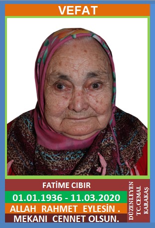 YENİCE BAĞBAŞI KÖYÜ NÜFUSUNA KAYITLI OLUP, ÖZAL MAHALLESİ BAŞAKAR SOKAK NO:2/9-7’DE İKAMET EDEN MERHUM HASAN ve ŞAZİYE KIZI, İNZİBAT MUSTAFA OLARAK BİLİNEN MUSTAFA CIBIR EŞİ, FATİME CIBIR (01.01.1936 DOĞUMLU) HAKKIN RAHMETİNE KAVUŞMUŞTUR. CENAZESİ  (12.03.2020 PERŞEMBE GÜNÜ)  ÖZAL MAHALLESİ MERKEZ CAMİİNDE ÖĞLE NAMAZINA MÜTEAKİP KILINACAK CENAZE NAMAZINDAN SONRA SON YOLCULUĞUNA UĞURLANACAKTIR. EŞİ MUSTFA CIBIR, ÇOCUKLARI MUSTAFA CIBIR, MERHUM RAZIK CIBIR, MAKBULE YILMAZ, NAZMİYE BAĞBAŞI, SULTAN BAĞBAŞI, BAHRİYE CIBIR, DAMATLARI MERHUM CENGİZ YILMAZ, RIFAT BAĞBAŞI, MUSTAFA BAĞBAŞI, İSA CIBIR. ALLAH RAHMET EYLESİN. MEKANI CENNET OLSUN. GERİDE BIRAKTIĞI SEVENLERİNE VE AİLESİNE BAŞSAĞLIĞI VE SABIR DİLERİZ.