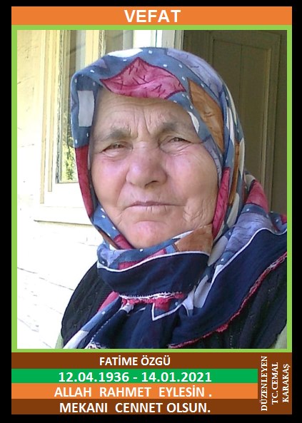 YENİCE HİSAR KÖYÜ NÜFUSUNA KAYITLI OLUP, HİSAR KÖYÜ KÖYİÇİ MEVKİİ NO: 5’DE İKAMET EDEN, MERHUM TAHİR ve MERHUME BAHİRE KIZI, MERHUM EMEKLİ ORMAN MUHAFAZA MEMURU ADİL ÖZGÜ EŞİ, GÖKÇEBEY ÇANAKÇILAR SERAMİK’TE MUHASEBE MÜDÜRÜ MEVLÜT ÖZGÜ’NÜN ANNESİ, FATİME ÖZGÜ (12.04.1936 DOĞUMLU) HAKKIN RAHMETİNE KAVUŞMUŞTUR. CENAZESİ (14.01.2021 PERŞEMBE GÜNÜ) HİSAR KÖYÜ KÖYİÇİ İLKOKUL ÖNÜNDE SAAT:11.00’DE KILINACAK CENAZE NAMAZINDAN SONRA SON YOLCULUĞUNA UĞURLANACAKTIR. EŞİ MERHUM ADİL ÖZGÜ, ÇOCUKLARI AHMET (MİTAT) ÖZGÜ, MEVLÜT ÖZGÜ, GÜLNAZ ÖZGÜ, MÜRVET YİRMİBEŞ, MÜNEVVER ÖREN, DAMATLARI YILMAZ ÖZGÜN, MEHMET YİRMİBEŞ, ERTAN ÖREN. ALLAH RAHMET EYLESİN. MEKANI CENNET OLSUN. GERİDE BIRAKTIĞI SEVENLERİNE VE AİLESİNE BAŞSAĞLIĞI VE SABIR DİLERİZ.