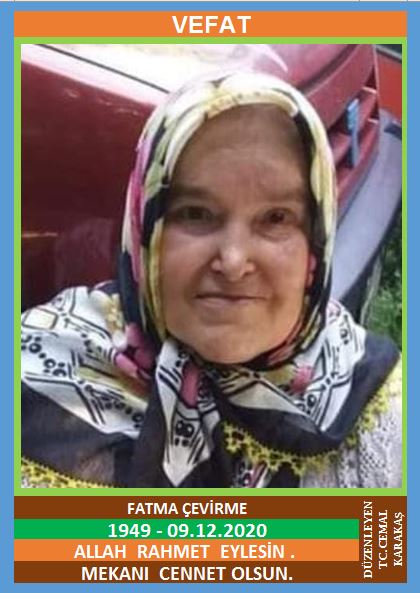 YENİCE YİRMİBEŞOĞLU KÖYÜ NÜFUSUNA KAYITLI OLUP, KARABÜK’TE İKAMET EDEN MERHUM MUSTAFA ve MERHUME SIDIKA KIZI, MERHUM MUSTAFA ÇEVİRME EŞİ, FATMA ÇEVİRME (1949 DOĞUMLU) HAKKIN RAHMETİNE KAVUŞMUŞTUR. CENAZESİ (09.12.2020 ÇARŞAMBA GÜNÜ) YİRMİBEŞİOĞLU KÖYÜ CAMİİNDE SAAT: 13.30’DA KILINACAK CENAZE NAMAZINDAN SONRA SON YOLCULUĞUNA UĞURLANACAKTIR. EŞİ MERHUM MUSTAFA ÇEVİRME, ÇOCUKLARI NİZAMETTİN ÇEVİRME, DURSUN ÇEVİRME, ERMAĞAN ÇEVİRME. ALLAH RAHMET EYLESİN. MEKANI CENNET OLSUN. GERİDE BIRAKTIĞI SEVENLERİNE VE AİLESİNE BAŞSAĞLIĞI VE SABIR DİLERİZ.