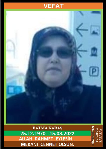 YENİCE AKMANLAR KÖYÜ KARAŞLAR MAHALLESİ NÜFUSUNA KAYITLI OLUP, AKMANLAR KÖYÜ KARAŞLAR KÜME EVLERİ NO :20/2’DE İKAMET EDEN ALİ ve HANIM KIZI, MADEN EMEKLİSİ HALİL KARAŞ EŞİ, FATMA KARAŞ (25.12.1970 DOĞUMLU) HAKKIN RAHMETİNE KAVUŞMUŞTUR. CENAZESİ (16.03.2022 ÇARŞAMBA GÜNÜ) AKMANLAR KÖYÜ KİRAZLAR CAMİİNDE ÖĞLE NAMAZINA MÜTEAKİP KILINACAK CENAZE NAMAZINDAN SONRA SON YOLCULUĞUNA UĞURLANACAKTIR. EŞİ MADEN EMEKLİSİ HALİL KARAŞ. ALLAH RAHMET EYLESİN. MEKANI CENNET OLSUN. GERİDE BIRAKTIĞI SEVENLERİNE VE AİLESİNE BAŞSAĞLIĞI VE SABIR DİLERİZ.