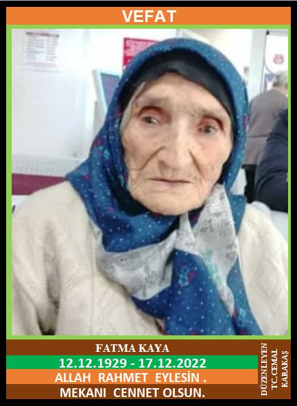 YENİCE DEĞİRMENYANI KÖYÜ MERKEZ MAHALLE NÜFUSUNA KAYITLI OLUP, DEĞİRMENYANI KÖYÜ MERKEZ MEVKİ KÜME EVLERİ NO : 15’DE İKAMET EDEN MERHUM CEMAL ve MERHUME AYŞE KIZI, MERHUM HÜSEYİN KAYA EŞİ, FATMAKAYA (12.12.2029 DOĞUMLU) HAKKIN RAHMETİNE KAVUŞMUŞTUR. CENAZESİ (17.12.2022 CUMARTESİ GÜNÜ) DEĞİRMENYANI KÖYÜ MERKEZ CAMİİNDE İKİNDİ NAMAZINA MÜTEAKİP KILINACAK CENAZE NAMAZINDAN SONRA SON YOLCULUĞUNA UĞURLANACAKTIR. EŞİ MERHUM HÜSEYİN KAYA, ÇOCUKLARI MUZAFFER KAYA, ŞERİF KAYA, CEMAL KAYA, NECATİ KAYA, MERHUM RAMAZAN KAYA, GÜLSÜN KAYA, TORUNU VEYSEL KAYA. ALLAH RAHMET EYLESİN. MEKANI CENNET OLSUN. GERİDE BIRAKTIĞI SEVENLERİNE VE AİLESİNE BAŞSAĞLIĞI VE SABIR DİLERİZ.