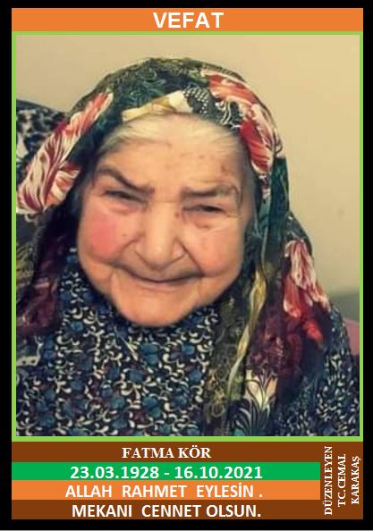 YENİCE AKMANLAR KÖYÜ KARAŞLAR MAHALLESİ NÜFUSUNA KAYITLI OLUP, AKMANLAR KÖYÜ KARAŞLAR KÜME EVLERİ NO:37’DE İKAMET EDEN MERHUM MEHMET ve MERHUME ZELİHA KIZI, MERHUM MEHMET KÖR EŞİ, FATMA KÖR (23.03.1928 DOĞUMLU) HAKKIN RAHMETİNE KAVUŞMUŞTUR. CENAZESİ (17.10.2021 PAZAR GÜNÜ) AKMANLAR KÖYÜ KİRAZLAR CAMİİNDE ÖĞLE NAMAZINA MÜTEAKİP KILINACAK CENAZE NAMAZINDAN SONRA SON YOLCULUĞUNA UĞURLANACAKTIR. EŞİ MERHUM MEHMET KÖR, ÇOCUKLARI KAMİL KÖR, İBRAHİM KÖR, MEHMET KÖR, MUSTAFA KÖR . ALLAH RAHMET EYLESİN. MEKANI CENNET OLSUN. GERİDE BIRAKTIĞI SEVENLERİNE VE AİLESİNE BAŞSAĞLIĞI VE SABIR DİLERİZ.