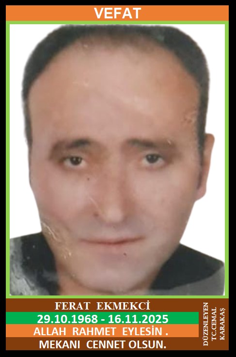 İLÇEMİZ İSMETPAŞA MAHALLESİ NÜFUSUNA KAYITLI OLUP, ZONGULDAK İLİ EREĞLİ İLÇESİ BOZHANE MAHALLESİ’NDE İKAMET EDEN FEVZİ EKMEKCİ ve NACİYE EKMEKCİ OĞLU, YENİCE ESKİ BELEDİYE BAŞKANI EROL YİRMİBEŞ’İN YEĞENİ, FERAT EKMEKCİ (29.10.1968 DOĞUMLU) HAKKIN RAHMETİNE KAVUŞMUŞTUR. CENAZESİ (16.11.2025 PAZAR GÜNÜN) ZONGULDAK İLİ EREĞLİ İLÇESİ BOZHANE MAHALLESİ BOZHANE CAMİİNDE ÖĞLE NAMAZI SONRASI KILINACAK CENAZE NAMAZI ve AKABİNDE YENİCE İSMETPAŞA MAHALLESİ MERKEZ CAMİİNDE İKİNDİ NAMAZINA MÜTEAKİP KILINACAK CENAZE NAMAZINDAN SONRA SON YOLCULUĞUNA UĞURLANACAKTIR. BABASI FEVZİ EKMEKCİ, ANNESİ NACİYE EKMEKCİ,  ÇOCUKLARI DİDEM EKMEKCİ, AHMET KEREM EKMEKCİ, AMCALARI ALİ EKMEKCİ, FEHMİ EKMEKCİ, DAYILARI EROL YİRMİBEŞ, SELİM YİRMİBEŞ, MEHMET YİRMİBEŞ, HALALARI SAKİNE GÜVEN, HANİFE TELLİ, MERYEM TELLİ, ZEYNEP AYDINLI. ALLAH RAHMET EYLESİN. MEKANI CENNET OLSUN. GERİDE BIRAKTIĞI SEVENLERİNE VE AİLESİNE BAŞSAĞLIĞI VE SABIR DİLERİZ.