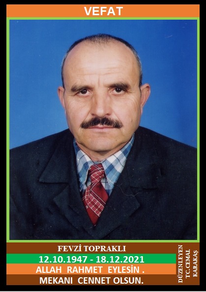 YENİCE İSMETPAŞA MAHALLESİ NÜFUSUNA KAYITLI OLUP, İSMETPAŞA MAHALLESİ BEYAZIT SOKAK NO : 25’DE İKAMET EDEN MERHUM MEHMET ve MERHUME HATİCE OĞLU, RABİA TOPRAKLI EŞİ, YENİCE ESNAFLARINDAN ADNAN ÜSKÜDARLI’NIN ENİŞTESİ, CİN HOCA OLARAK BİLİNEN FEVZİ TOPRAKLI (12.10.1947 DOĞUMLU) HAKKIN RAHMETİNE KAVUŞMUŞTUR. CENAZESİ (18.12.2021 CUMARTESİ GÜNÜ) İSMETPAŞA MAHALLESİ MERKEZ CAMİİNDE İKİNDİ NAMAZINA MÜTEAKİP KILINACAK CENAZE NAMAZINDAN SONRA SON YOLCULUĞUNA UĞURLANACAKTIR. EŞİ RABİA TOPRAKLI, ÇOCUKLARI KAYHAN TOPRAKLI, AYHAN TOPRAKLI, NURTEN BELEN, KARDEŞLERİ KAZIM TOPRAKLI, ŞEVKİ TOPRAKLI, ALİ TOPRAKLI, HASAN TOPRAKLI, DÖNDÜ BASAN, HATİCE YİRMİBEŞ, RABİA KARADAYI , KAYINBİLADERİ  ADNAN ÜSKÜDARLI. ALLAH RAHMET EYLESİN. MEKANI CENNET OLSUN. GERİDE BIRAKTIĞI SEVENLERİNE VE AİLESİNE BAŞSAĞLIĞI VE SABIR DİLERİZ.