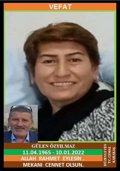 YENİCE YENİKÖY NÜFUSUNA KAYITLI OLUP, ANKARA İLİ KEÇİÖREN MAHALLESİ’NDE İKAMET EDEN MERHUM ŞEVKET ve MERHUME REMZİYE KIZI, EMEKLİ POLİS MEMURU ŞERAFETTİN ÖZYILMAZ’IN EŞİ YENİCE KAYMAKAMLIK PERSONELİ MEHMET GÜRKAN ÇAKIR’IN YENGESİ, GÜLEN ÖZYILMAZ (11.04.1965 DOĞUMLU) HAKKIN RAHMETİNE KAVUŞMUŞTUR. CENAZESİ (11.01.2022 SALI GÜNÜ) KARABÜK İLİ SOĞUKSU MAHALLESİ CAMİİNDE ÖĞLE NAMAZINA MÜTEAKİP KILINACAK CENAZE NAMAZINDAN SONRA SON YOLCULUĞUNA UĞURLANACAKTIR. EŞİ EMEKLİ POLİS MEMURU ŞERAFETTİN ÖZYILMAZ, ÇOCUKLARI ANIL YALÇIN, ASLİN SARI, ASLIHAN ÖZYILMAZ, YEĞENİ MEHMET GÜRKAN ÇAKIR. ALLAH RAHMET EYLESİN. MEKANI CENNET OLSUN. GERİDE BIRAKTIĞI SEVENLERİNE VE AİLESİNE BAŞSAĞLIĞI VE SABIR DİLERİZ.