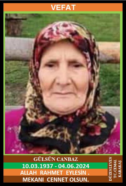 İLÇEMİZ ESENKÖY MERKEZ MAHALLESİ NUFÜSUNA KAYITLI OLUP, ESENKÖY MERKEZ KÜME EVLERİ NO:30’DA İKAMET EDEN MERHUM ALİ ve MERHUME AYİŞE KIZI, MERHUM YAŞAR CANBAZ EŞİ, S.S. ESENKÖY TARIMSAL KALKINMA KOOPERATİF BAŞKANI KEMAL CANBAZ’ IN ANNESİ GÜLSÜN CANBAZ (10.03.1937 DOĞUMLU) HAKKIN RAHMETİNE KAVUŞMUŞTUR, CENAZESİ (04.06.2024 SALI GÜNÜ) ESENKÖY MERKEZ CAMİİNDE İKİNDİ NAMAZINA MÜTEAKİP KILINACAK CENAZE NAMAZINDAN SONRA SON YOLCULUĞUNA UĞURLANACAKTIR. EŞİ MERHUM YAŞAR CANBAZ, KEMAL CANBAZ, MEHMET CANBAZ, KAZIM CANBAZ, CEMAL CANBAZ, AYŞE CEYLAN, DURDANE CEYLAN, FATMA TAVUKCU, EMİNE KARAKURLUK, ZEYNEP SARIBAŞ, GÜLİSTAN DERELİ, DAMATLARI KAMİL ÇAKIR, MEHMET ALİ CEYLAN, MUSTAFA KARAKURLUK, ŞEVKİ TAVUKCU, RAHMİ SARIBAŞ, EROL DERELİ, CELAL CEYLAN. ALLAH RAHMET EYLESİN. MEKANI CENNET OLSUN. GERİDE BIRAKTIĞI SEVENLERİNE VE AİLESİNE BAŞSAĞLIĞI VE SABIR DİLERİZ.