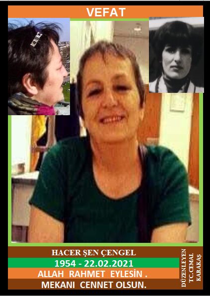 YENİCE ATATÜRK MAHALLESİ NÜFUSUNA KAYITLI OLUP, ZONGULDAK İLİ ALAPLI İLÇESİNE’DE İKAMET YENİCE ATATÜRK MAHALLESİNDE UZUN YILLAR ÖĞRETMENLİK YAPAN ve YENİCE İLÇESİ ESKİ İLÇE MİLLİ EĞİTİM MÜDÜRÜ METİN ÇENGEL’İN EŞİ EMEKLİ ÖĞRETMEN HACER ŞEN ÇENGEL (1954 DOĞUMLU) HAKKIN RAHMETİNE KAVUŞMUŞTUR. CENAZESİ (23.02.2021 SALI GÜNÜ) YENİCE ATATÜRK MAHALLESİ MERKEZ CAMİİNDE SAAT: 13.30’DA KILINACAK CENAZE NAMAZINA MÜTEAKİP AİLE MEZARLIĞINA DEFNEDİLEREK SON YOLCULUĞUNA UĞURLANACAKTIR. EŞİ METİN ÇENGEL, ÇOCUKLARI ÜLKEM ÇENGEL, KURTULUŞ ÇENGEL. ALLAH RAHMET EYLESİN. MEKANI CENNET OLSUN. GERİDE BIRAKTIĞI SEVENLERİNE VE AİLESİNE BAŞSAĞLIĞI VE SABIR DİLERİZ.