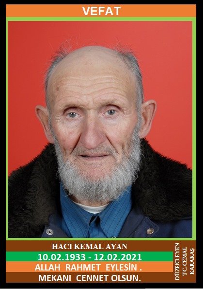 YENİCE TIR KÖYÜ CAMİYANI MAHALLESİ NÜFUSUNA KAYITLI OLUP, TIR KÖYÜ CAMİYANI MAHALLESİ NO:48/A’DA İKAMET EDEN MERHUM MEHMET ve MERHUME HATİCE OĞLU, MERHUME HATİCE AYAN EŞİ HACI KEMAL AYAN (10.02.1933 DOĞUMLU) HAKKIN RAHMETİNE KAVUŞMUŞTUR. CENAZESİ (12.02.2021 CUMA GÜNÜ) YENİCE MERKEZ CAMİİNDE SAAT: 17.00’DA KILINACAK CENAZE NAMAZINA MÜTEAKİP AİLE MEZARLIĞINA DEFNEDİLEREK SON YOLCULUĞUNA UĞURLANACAKTIR. EŞİ MERHUME HATİCE AYAN, ÇOCUKLARI AKİF AYAN, İHSAN AYAN, MERHUM HATİCE ÇAYLI, SAFİYE İKİZOĞLU, NURİ AYAN, FATMA KANCA, HANİFE KOYMATOĞLU, EMİNE ÖZGÜN, SAMİYE ÖRENLİ, DAMATLARI REMZİ ÇAYLI, MUZAFFER İKİZOĞLU, ŞABAN KANCA, KENAN KOYMATOĞLU, İHSAN ÖZGÜN, İZZET ÖRENLİ. ALLAH RAHMET EYLESİN. MEKANI CENNET OLSUN. GERİDE BIRAKTIĞI SEVENLERİNE VE AİLESİNE BAŞSAĞLIĞI VE SABIR DİLERİZ.