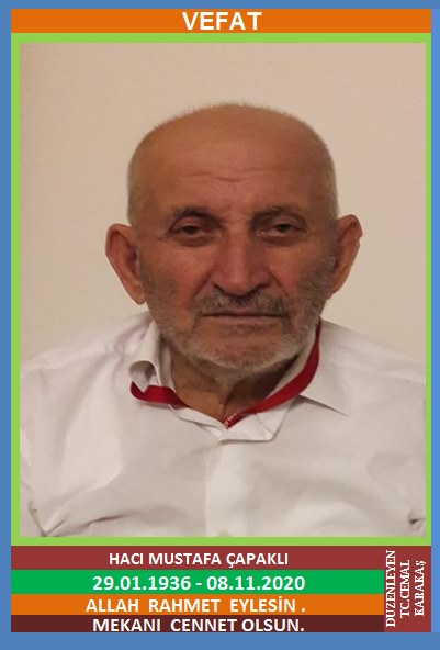 YENİCE CİHANBEY KÖYÜ CEMBEK MAHALLESİ NÜFUSUNA KAYITLI OLUP,  CENBEK KÜME EVLERİ NO:13’DE İKAMET EDEN MERHUM MUSTAFA ve AYŞE OĞLU, DURKADIN ÇAPAKLI EŞİ, HACI MUSTAFA ÇAPAKLI (29.01.1936 DOĞUMLU) HAKKIN RAHMETİNE KAVUŞMUŞTUR. CENAZESİ  (08.11.2020 PAZAR GÜNÜ) CİHANBEY KÖYÜ CENBEK’TE SON YOLCULUĞUNA UĞURLANACAKTIR. EŞİ DURKADIN ÇAPAKLI, ÇOCUKLARI HATİCE ÇAKIR, AYŞE ÇAPAKLI, BAHRİYE ÇAPAKLI, FADİME ÇAKIR, MAKBULE BOSTANCI, DÖNDÜ BOSTANCI, DAMATLARI MEHMET ÇAKIR, ÖMER ÇAPAKLI, ZİYA ÇAPAKLI, NİYAZİ ÇAKIR, ZEKİ BOSTANCI, MERHUM ZEKİ BOSTANCI. ALLAH RAHMET EYLESİN. MEKANI CENNET OLSUN. GERİDE BIRAKTIĞI SEVENLERİNE VE AİLESİNE BAŞSAĞLIĞI VE SABIR DİLERİZ.