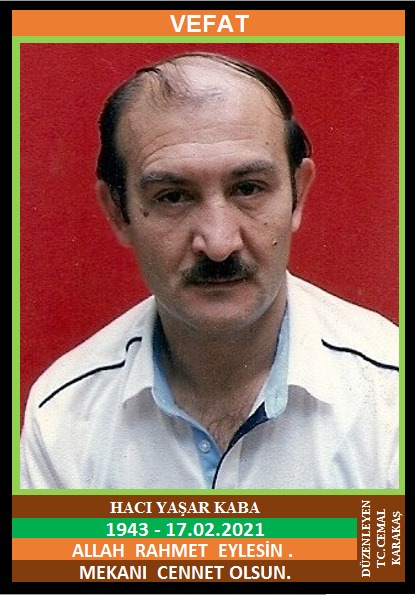 YENİCE MENDERES MAHALLESİ KABONOZLAR KÜME EVLERİ NÜFUSUNA KAYITLI OLUP, UZUN YILLAR ALMANYA’DA VE HOCA AHMET YESEVİ CADDESİNDE İKAMET EDEN MERHUM KABONOZ MEHMET LAKABIYLA BİLİNEN MEHMET KABA ve MERHUME HATİCE KABA OĞLUU, MERHUME NAHİDE KABA EŞİ ALMANYA’DA YAŞAYAN HACI YAŞAR KABA (1943 DOĞUMLU) HAKKIN RAHMETİNE KAVUŞMUŞTUR. 20 ŞUBAT 2021 CUMARTESİ GÜNÜ SAAT 13.30’DA YENİCE YEŞİL CAMİDE KILINAN CENAZE NAMAZINA MÜTEAKİP AİLE MEZARLIĞINDA SON YOLCULUĞA UĞURLANACAKTIR. EŞİ MERHUME NAHİDE KABA, ÇOCUKLARI İLYAS KABA, MUSTAFA KABA, KIZLARI FATMA KABA, SEVİM ATAMAN. KARDEŞLERİ MERHUM KUSTAFA KABA, HANİFE KARAKAŞ, ENİŞTESİ ZABITA KOMİSERİ EMEKLİSİ İZZET KARAKAŞ. ALLAH RAHMET EYLESİN. MEKANI CENNET OLSUN. GERİDE BIRAKTIĞI SEVENLERİNE VE AİLESİNE BAŞSAĞLIĞI VE SABIR DİLERİZ.