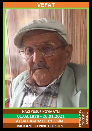 YENİCE ÇELTİK KÖYÜ NÜFUSUNA KAYITLI OLUP, YENİCE YİRMİBEŞLER MAHALLESİ YİRMİBEŞLER KÜME EVLERİ NO:9/2’DE İKAMET EDEN MERHUM İZZET ve MERHUME HANİFE OĞLU, HACI NEZAKET KOYMATLI EŞİ, YENİCE ESKİ BELEDİYE MECLİS ÜYESİ, KÖLE YUSUF LAKABI İLE BİLİNEN, HACI YUSUF KOYMATLI (01.03.1928 DOĞUMLU) HAKKIN RAHMETİNE KAVUŞMUŞTUR. CENAZESİ (26.01.2021 SALI GÜNÜ) YENİCE MERKEZ CAMİİNDE SAAT:15.30’DA KILINACAK CENAZE NAMAZINDAN SONRA SON YOLCULUĞUNA UĞURLANACAKTIR. EŞİ HACI NEZAKET KOYMATLI, ÇOCUKLARI METİN KOYMATLI, SİNAN KOYMATLI, NAZİKER İNAM, HASAN SAZOĞLU, DAMADI MEHMET İNAM. ALLAH RAHMET EYLESİN. MEKANI CENNET OLSUN. GERİDE BIRAKTIĞI SEVENLERİNE VE AİLESİNE BAŞSAĞLIĞI VE SABIR DİLERİZ.