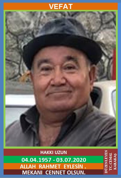 YENİCE SATUK KÖYÜ NÜFUSUNA KAYITLI OLUP, SATUK KÖYÜ BALIKISIK KÜME EVLERİ NO: 115/1’DE İKAMET EDEN ALİ OSMAN ve FATMA OĞLU, HATİCE UZUN EŞİ, TTK EMEKLİSİ HAKKI UZUN (04.04.1957 DOĞUMLU) HAKKIN RAHMETİNE KAVUŞMUŞTUR. CENAZESİ (03.07.2020 CUMA GÜNÜ) SATUK KÖYÜ BALIKISIK UZUMKUM DA SAAT: 15.00’DA KILINACAK CENAZE NAMAZINA MÜTEAKİP SON YOLCULUĞUNA UĞURLANACAKTIR. BABASI ALİ OSMAN UZUN, EŞİ HATİCE UZUN, ÇOCUKLARI ALİ OSMAN UZUN, GÜL DERELİ, DAMADI GÖKHAN DERELİ, KARDEŞLERİ RAMAZAN UZUN, MAHİR UZUN, FATMA EKMEKCİ, NAZİKER EKMEKCİ. ALLAH RAHMET EYLESİN. MEKANI CENNET OLSUN. GERİDE BIRAKTIĞI SEVENLERİNE VE AİLESİNE BAŞSAĞLIĞI VE SABIR DİLERİZ.