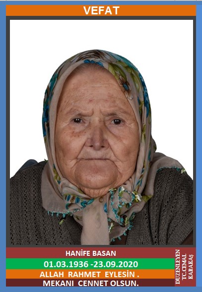 YENİCE İSMETPAŞA MAHALLESİ NÜFUSUNA KAYITLI OLUP, İSMETPAŞA MAHALLESİ ÇANKAYA CADDESİ’NDE İKAMET EDEN MERHUM MEHMET ve AYŞE KIZI, YORÜS EMEKLİSİ MERHUM DURMUŞ BASAN EŞİ CEBECİ KIZI NAMI İLE BİLİNEN HANİFE BASAN (01.03.1936 DOĞUMLU) HAKKIN RAHMETİNE KAVUŞMUŞTUR. CENAZESİ (23.09.2020 ÇARŞAMBA GÜNÜ) YENİCE İSMETPAŞA MAHALLESİ MERKEZ CAMİİNDE SAAT: 17.30’DA KILINACAK CENAZE NAMAZINDAN SONRA SON YOLCULUĞUNA UĞURLANACAKTIR. EŞİ YORÜS EMEKLİSİ MERHUM DURMUŞ BASAN, ÇOCUKLARI YAŞAR BASAN, ADEM BASAN, SAFİYE TOPRAKLI, KEZBAN ELİEYİOĞLU, HANİFE (AYNUR) KASKATI, MERHUM YETER ÇANAKCI, DAMATLARI MERHUM DURSUN TOPRAKLI, ORHAN ELİEYİOĞLU, RECEP KASKATI, MERHUM YETER ÇANAKCI. ALLAH RAHMET EYLESİN. MEKANI CENNET OLSUN. GERİDE BIRAKTIĞI SEVENLERİNE VE AİLESİNE BAŞSAĞLIĞI VE SABIR DİLERİZ.