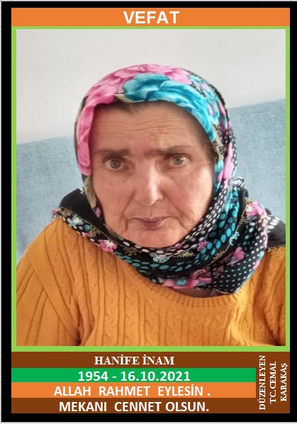 YENİCE DEREBAŞI KÖYÜ NÜFUSUNA KAYITLI OLUP, KARABÜK KAPULU MAHALLESİNDE İKAMET EDEN MERHUM SALİH ve MERHUME FATİME KIZI, MERHUM ZİYA İNAM EŞİ, YENİCE BERBEROĞLU MARKET SAHİBİ YILMAZ BERBER’İN TEYZESİ, HANİFE İNAM (1954 DOĞUMLU) HAKKIN RAHMETİNE KAVUŞMUŞTUR. CENAZESİ (17.10.2021 PAZAR GÜNÜ) ATATÜRK MAHALLESİ NİŞANTAŞI CAMİİNDE ÖĞLE NAMAZINA MÜTEAKİP KILINACAK CENAZE NAMAZINDAN SONRA SON YOLCULUĞUNA UĞURLANACAKTIR. EŞİ MERHUM ZİYA İNAM, ÇOCUKLARI ARZU METİN, ERMAN KAYABAŞI, YADİGAR GÜNEY, DAMATLARI AHMET METİN, MEHMET KAYABAŞI, MURAT GÜNEY, ALLAH RAHMET EYLESİN. MEKANI CENNET OLSUN. GERİDE BIRAKTIĞI SEVENLERİNE VE AİLESİNE BAŞSAĞLIĞI VE SABIR DİLERİZ.