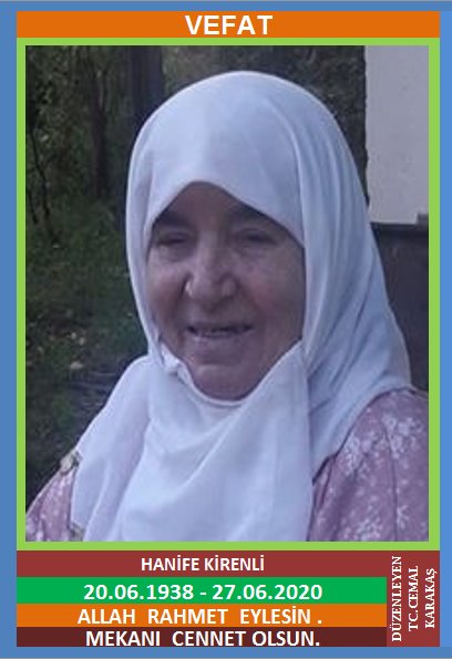YENİCE SATUK KÖYÜ NÜFUSUNA KAYITLI OLUP, SATUK KÖYÜ DERE KÜME EVLERİ NO: 12’DE İKAMET EDEN MERHUM MEHMET ve SIDIKA KIZI, MERHUM HACI KAZIM KİRENLİ EŞİ, HANİFE KİRENLİ (20.06.1938 DOĞUMLU) HAKKIN RAHMETİNE KAVUŞMUŞTUR. CENAZESİ (27.06.2020 CUMARTESİ GÜNÜ) KARABÜK’DE KILINACAK CENAZE NAMAZINA MÜTEAKİP SON YOLCULUĞUNA UĞURLANACAKTIR. EŞİ MERHUM HACI KAZIM KİRENLİ, ÇOCUKLARI HATİCE KİRENLİ, KEZBAN BOZMA, DAMATLARI MEHMET KİRENLİ, SALİH TİRYAKİ, ALLAH RAHMET EYLESİN. MEKANI CENNET OLSUN. GERİDE BIRAKTIĞI SEVENLERİNE VE AİLESİNE BAŞSAĞLIĞI VE SABIR DİLERİZ.