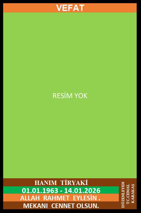 İLÇEMİZ KARAHASANLAR KÖYÜ NÜFUSUNA KAYITLI OLUP,  KARAHASANLAR KÖYÜ MERKEZ MEVKİ NO: 65/A’DA İKAMET EDEN MERHUM DURMUŞ ve MERHUME AYŞE KIZI, MERHUM MEHMET TİRYAKİ EŞİ, HANIM TİRYAKİ (01.01.1963 DOĞUMLU) HAKKIN RAHMETİNE KAVUŞMUŞTUR. CENAZESİ (14.01.2026 ÇARŞAMBA GÜNÜ) KARAHASANLAR KÖYÜ MERKEZ CAMİİNDE ÖĞLE NAMAZINA MÜTEAKİP KILINACAK CENAZE NAMAZINDAN SONRA SON YOLCULUĞUNA UĞURLANACAKTIR. EŞİ MERHUM MEHMET TİRYAKİ, ÇOCUKLARI BİLAL TİRYAKİ, ABDULLAH TİRYAKİ, ZEYNEP ALAGÖZ, DAMADI ERDOĞAN ALAGÖZ. ALLAH RAHMET EYLESİN. MEKANI CENNET OLSUN. GERİDE BIRAKTIĞI SEVENLERİNE VE AİLESİNE BAŞSAĞLIĞI VE SABIR DİLERİZ.