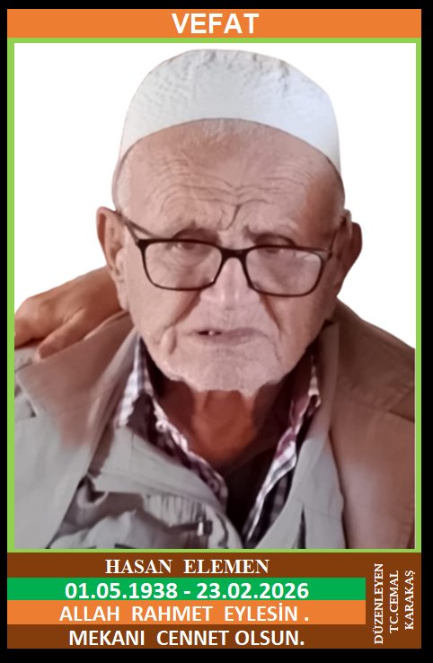 İLÇEMİZ YORTAN BELDESİ MERKEZ MAHALLESİ NÜFUSUNA KAYITLI OLUP, YORTAN BELDESİ MERKEZ MAHALLESİ HATİPOĞLU CADDESİ NO:47/1’DE İKAMET MERHUM ALİ ve MERHUME FATİME OĞLU, MERHUME HATİCE ELEMEN EŞİ, HASAN YAMAN OLARAK BİLİNEN HASAN ELEMEN (01.05.1938 DOĞUMLU) HAKKIN RAHMETİNE KAVUŞMUŞTUR. CENAZESİ (24.02.2026 SALI GÜNÜ) YORTAN BELDESİ MERKEZ CAMİİNDE ÖĞLE NAMAZINA MÜTEAKİP KILINACAK CENAZE NAMAZINDAN SONRA SON YOLCULUĞUNA UĞURLANACAKTIR. EŞİ MERHUME HATİCE ELEMEN, ÇOCUKLARI HASAN ELEMEN, ALİ ELEMEN, RECEP ELEMEN, FATMA KOCAKAYA, MAKBULE ÇENGEL, DAMATLARI YILMAZ KOCAKAYA, KAMİL ÇENGEL. ALLAH RAHMET EYLESİN. MEKANI CENNET OLSUN. GERİDE BIRAKTIĞI SEVENLERİNE VE AİLESİNE BAŞSAĞLIĞI VE SABIR DİLERİZ.